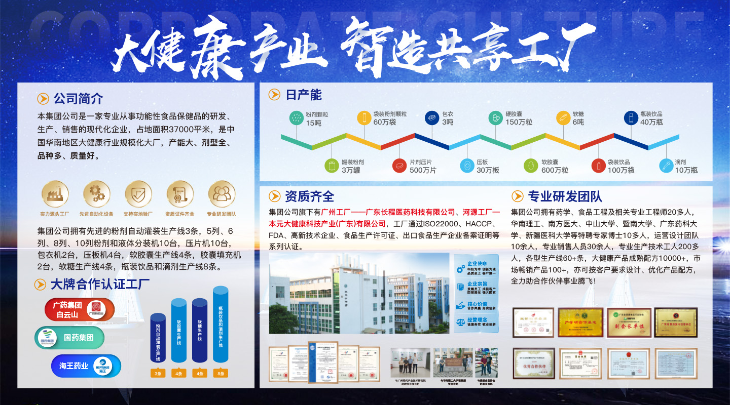 本元大健康集團(tuán)公司是一家專業(yè)從事功能性食品保健品的研發(fā)、生產(chǎn)、銷售的現(xiàn)代化企業(yè),旗下有廣州工廠--廣東長程醫(yī)藥生物科技有限公司和河源工廠--本元大健康科技產(chǎn)業(yè)(廣東)有限公司,總占地面積37000平米,是中國華南地區(qū)大健康行業(yè)規(guī)模化大廠,產(chǎn)能大、劑型全、品種多、質(zhì)量好。