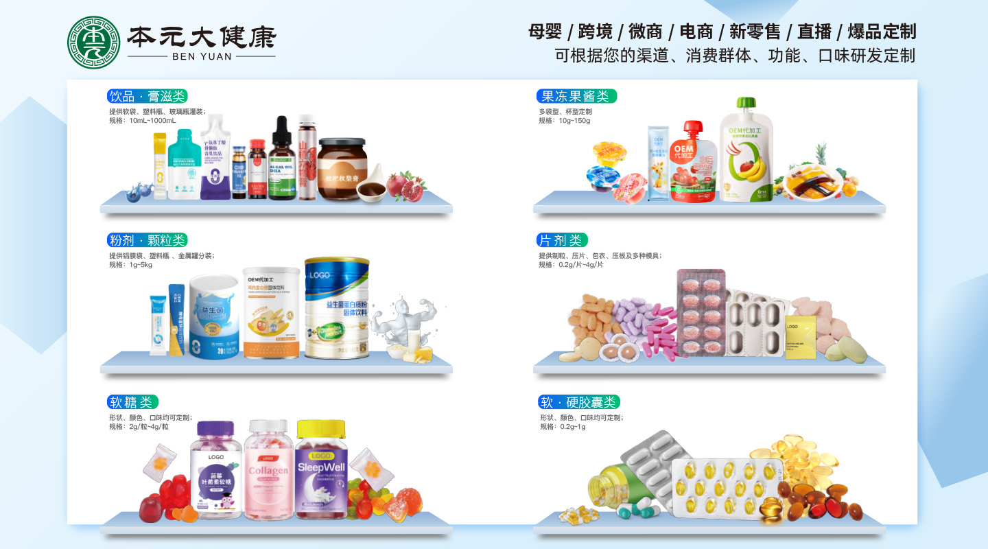 品牌名稱:本元大健康OEM代加工 主營產(chǎn)品:功能性飲品、膏滋、果凍 品牌特色:加工貼牌一站式服務(wù)