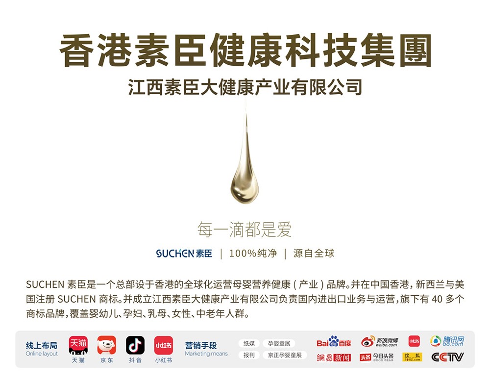 SUCHEN素臣是一個(gè)總部設(shè)于香港的全球化運(yùn)營(yíng)母嬰營(yíng)養(yǎng)健康(產(chǎn)業(yè))品牌,用制藥的標(biāo)準(zhǔn)重新定義醫(yī)學(xué)功能營(yíng)養(yǎng)品,深耕醫(yī)學(xué)功能營(yíng)養(yǎng)研發(fā),精選全球頭部原料,為全球家庭提供健康解決方案。并已在中國(guó)香港,新西蘭與美國(guó)注冊(cè)知識(shí)產(chǎn)權(quán)。旗下有40多個(gè)商標(biāo)品牌,產(chǎn)品覆蓋嬰幼兒、孕婦、乳母、女性、中老年人群。