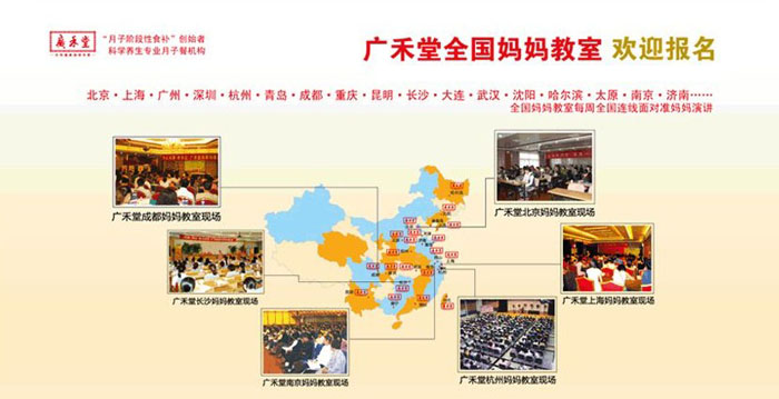 自成立以來,廣禾堂分別與上海“國際和平婦嬰保健院”、“第一婦嬰浦東分院”、“長寧婦幼保健院”、“上海美華醫(yī)院”、“計(jì)生委宣教中心”、“龍鳳食品”等單位密切合作,共同致力于“正確的養(yǎng)胎及坐月子方法”科學(xué)理念的推廣。