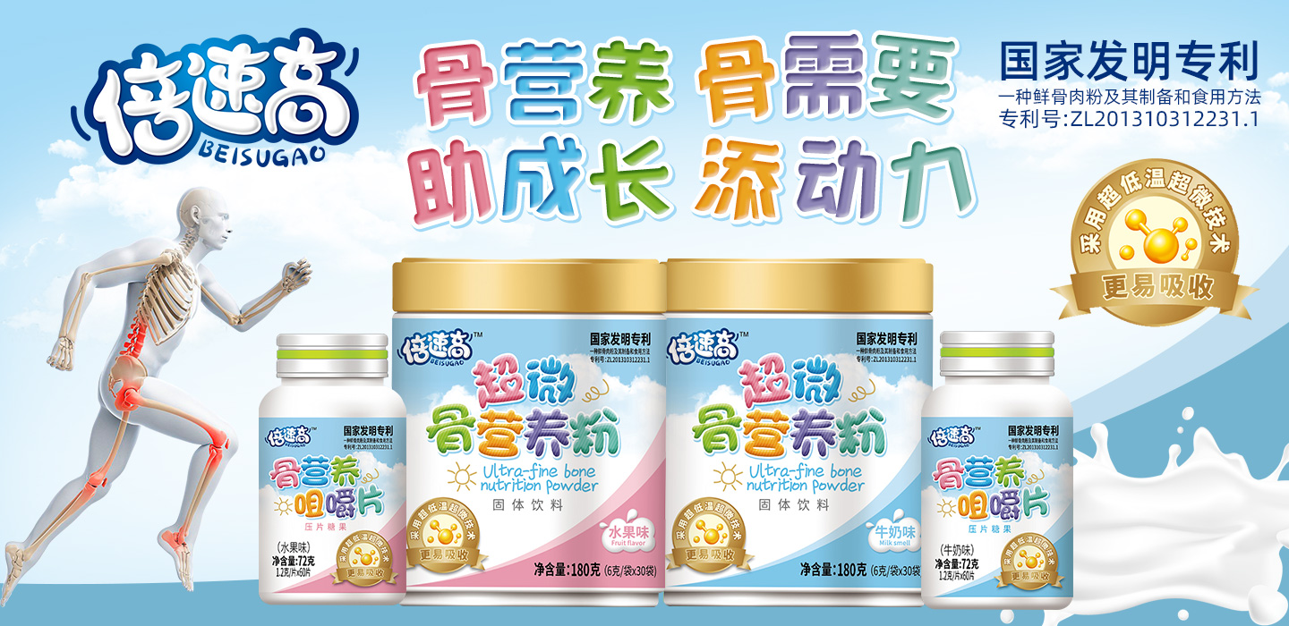 品牌名稱:倍速高 主營(yíng)產(chǎn)品:倍速高超微骨營(yíng)養(yǎng)粉,咀嚼片 品牌特色:科學(xué)營(yíng)養(yǎng) 助力健康