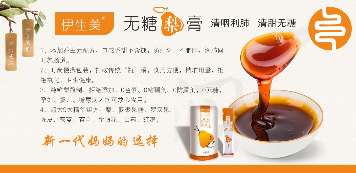 伊生美無糖梨膏,不含冰糖、不含蜂蜜!其4大賣點(diǎn):1、獨(dú)家添加益生元配方,口感香甜不含糖,防蛀牙、不肥胖,潤肺同時(shí)養(yǎng)腸道。2、時(shí)尚便攜包裝,打破傳統(tǒng)“瓶”頸,食用方便,精準(zhǔn)用量,拒絕氧化,衛(wèi)生健康。3、純鮮梨熬制,拒絕添加,0色素、0粘稠劑、0防腐劑,0蔗糖,孕婦、嬰兒、糖尿病人均可放心食用。4、超大9大精華組方:梨、低聚果糖、羅漢果、陳皮、茯苓、百合、金銀花、山藥、紅棗,潤肺去燥、提升免疫、呵護(hù)腸道、一膏多效,面面俱到!