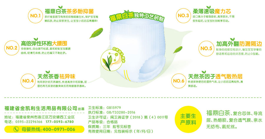 公司利用自身多年的紙尿褲的生產(chǎn)經(jīng)驗(yàn)和技術(shù)優(yōu)勢(shì),將福鼎白茶成分融入紙尿褲芯體中。福鼎白茶防疹紙尿褲在保持傳統(tǒng)嬰兒紙尿褲產(chǎn)品已有的普通功能外,更有多項(xiàng)新的技術(shù)突破。