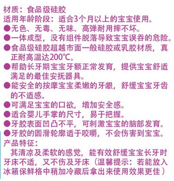 本品采用高級(jí)食品級(jí)矽膠(Liquid Silicone)制成,無(wú)毒、無(wú)味、耐高溫120℃可消毒、極好韌性、不易破、更耐用。本品對(duì)嬰兒牙床的發(fā)育和牙齦的保護(hù)有特殊效果。能促進(jìn)嬰兒牙齒的正常發(fā)育及臉部肌肉運(yùn)動(dòng)。
