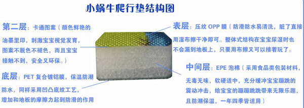 小蝸牛爬行墊無(wú)毒無(wú)味,防潮隔濕,超大無(wú)縫,表面附帶精美的童話圖案,從寶寶學(xué)爬到練習(xí)走路,再到大點(diǎn)在地上玩耍蹦跳,都是不錯(cuò)的選擇,是寶寶健康快樂(lè)成長(zhǎng)的好伴侶。