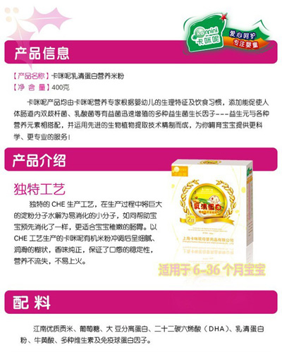 卡咪呢乳清蛋白嬰幼兒營(yíng)養(yǎng)米粉是上?ㄟ淠啬笅胗闷酚邢薰酒煜庐a(chǎn)品,精選優(yōu)質(zhì)大米制作,特別添加乳清蛋白和益生元,提高寶寶抵抗力,促進(jìn)寶寶changdao的消化吸收,上市以來(lái)廣受父母消費(fèi)者的青睞。