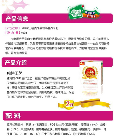 卡咪呢乳清蛋白嬰幼兒營養(yǎng)米粉是上?ㄟ淠啬笅胗闷酚邢薰酒煜庐a(chǎn)品,精選優(yōu)質(zhì)大米制作,特別添加乳清蛋白和益生元,提高寶寶抵抗力,促進寶寶changdao的消化吸收,上市以來廣受父母消費者的青睞。