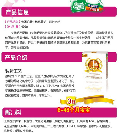 卡咪呢有機(jī)米粉系列是專為中國(guó)寶寶設(shè)計(jì)的營(yíng)養(yǎng)輔食,選用有機(jī)大米,科學(xué)搭配維生素AD等維生素,還特別添加;撬、DHA、AA等有助智力發(fā)育的營(yíng)養(yǎng)成分,富含15種營(yíng)養(yǎng)素,F(xiàn)上?ㄟ淠啬笅胗闷酚邢薰久嫦蛉珖(guó)空白市場(chǎng)區(qū)域誠(chéng)招卡咪呢有機(jī)米粉代理商。