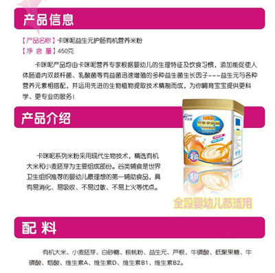 卡咪呢有機米粉系列是專為中國寶寶設計的營養(yǎng)輔食,選用有機大米,科學搭配維生素AD等維生素,還特別添加牛磺酸、DHA、AA等有助智力發(fā)育的營養(yǎng)成分,富含15種營養(yǎng)素,F(xiàn)上海卡咪呢母嬰用品有限公司面向全國空白市場區(qū)域誠招卡咪呢有機米粉代理商。