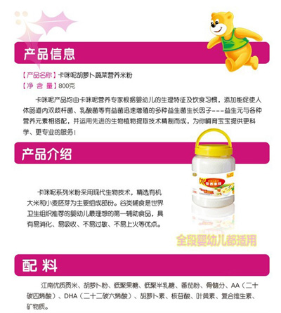卡咪呢有機(jī)米粉系列是專為中國寶寶設(shè)計的營養(yǎng)輔食,選用有機(jī)大米,科學(xué)搭配維生素AD等維生素,還特別添加牛磺酸、DHA、AA等有助智力發(fā)育的營養(yǎng)成分,富含15種營養(yǎng)素,F(xiàn)上海卡咪呢母嬰用品有限公司面向全國空白市場區(qū)域誠招卡咪呢有機(jī)米粉代理商。