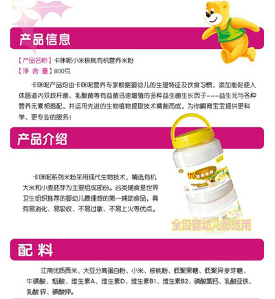 卡咪呢有機(jī)米粉系列是專為中國寶寶設(shè)計(jì)的營養(yǎng)輔食,選用有機(jī)大米,科學(xué)搭配維生素AD等維生素,還特別添加;撬、DHA、AA等有助智力發(fā)育的營養(yǎng)成分,富含15種營養(yǎng)素。現(xiàn)上?ㄟ淠啬笅胗闷酚邢薰久嫦蛉珖瞻资袌鰠^(qū)域誠招卡咪呢有機(jī)米粉代理商。