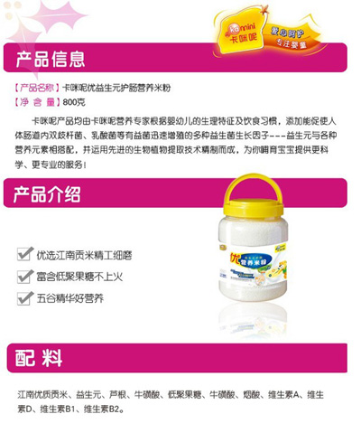 卡咪呢乳清蛋白嬰幼兒營養(yǎng)米粉是上海卡咪呢母嬰用品有限公司旗下產(chǎn)品,精選優(yōu)質(zhì)大米制作,特別添加乳清蛋白和益生元,提高寶寶抵抗力,促進(jìn)寶寶changdao的消化吸收,上市以來廣受父母消費(fèi)者的青睞。