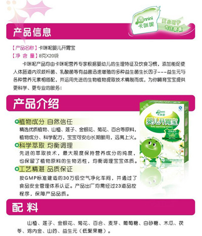 上海卡咪呢母嬰用品有限公司主營母嬰營養(yǎng)保健食品,產(chǎn)品原料來自有機(jī)農(nóng)業(yè)生產(chǎn)體系或野生天然產(chǎn)品,通過國家相關(guān)有機(jī)食品認(rèn)證機(jī)構(gòu)的嚴(yán)格檢測認(rèn)證,現(xiàn)面向全國空白市場區(qū)域誠招代理商加盟。