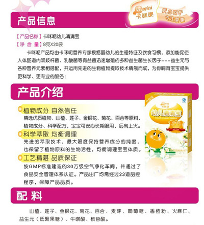 卡咪呢小兒板藍(lán)根顆粒是上?ㄟ淠啬笅胗闷酚邢薰酒煜庐a(chǎn)品,專為嬰幼兒設(shè)計(jì),專業(yè)、安全,幫助寶寶可以預(yù)防感冒抵抗病毒,是廣大父母育兒的好幫手?ㄟ淠匦喊逅{(lán)根顆粒不含任何色素、防腐劑,安全放心。