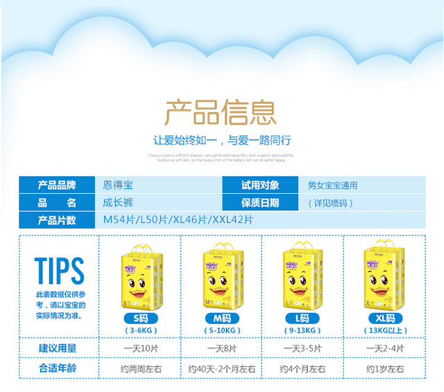 恩得寶是泉州市漢能衛(wèi)生用品有限公司旗下的紙尿褲品牌,它是一家專注于紙尿褲、拉拉褲、衛(wèi)生巾等產(chǎn)品生產(chǎn)加工的公司,擁有完整、科學(xué)的質(zhì)量管理體系。