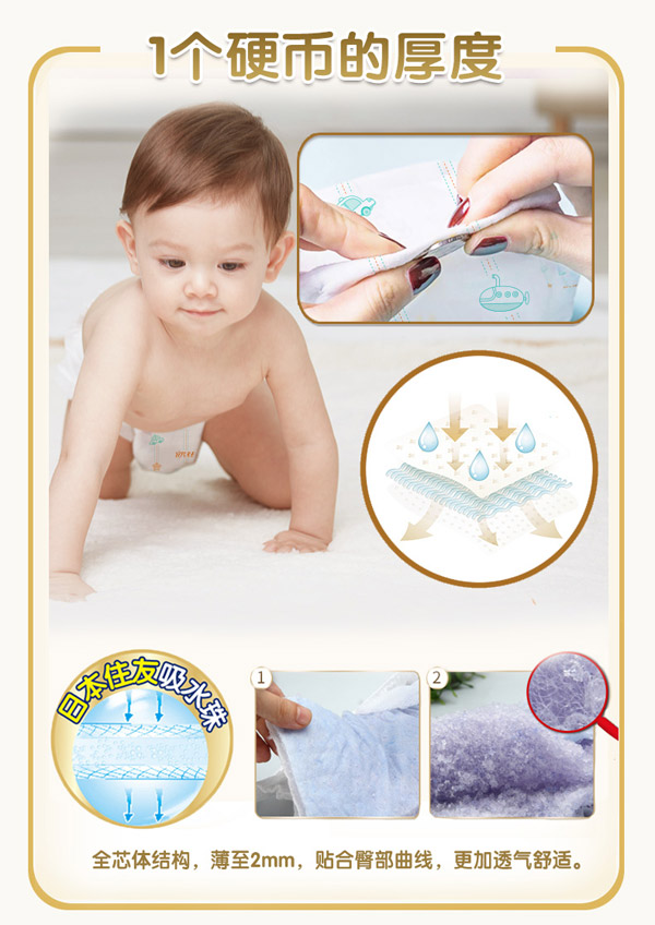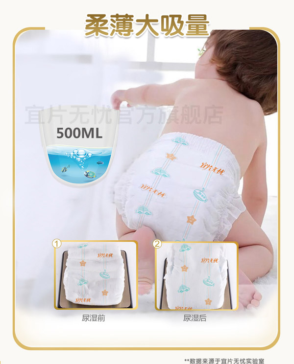 宜片無憂童趣紙尿褲采用熱風(fēng)材質(zhì),親膚柔軟,選用柔軟熱風(fēng)凸點無紡布作為面料,具有蓬松度高,彈性好,手感柔軟,透氣性好等特點,寶寶穿著舒適,玩的開心,睡得安心。
