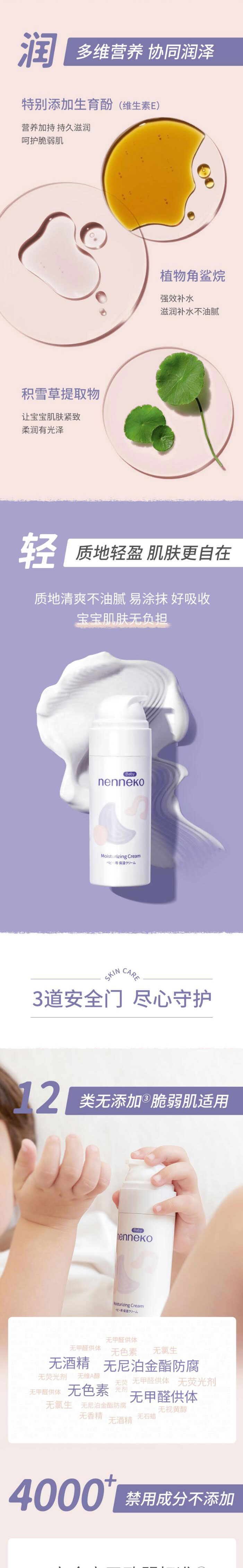 霓奈可嬰兒潤膚乳,以有機白池花籽油、有機向日葵籽油、甘油為主要成分,3重復(fù)配,以油養(yǎng)膚,深度滋潤每一寸肌膚。特別添加生育酚(維生素E)、植物角鯊?fù)、積雪草提取物,高效保濕,強效補水,持久滋潤。質(zhì)地清爽不油膩,易涂抹,好吸收,肌膚無負擔(dān)。12類無添加,安心配方,快速吸收,有效防護,脆弱肌膚適用。