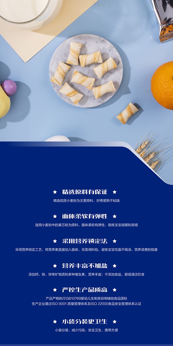 優(yōu)質(zhì)麥粉及新鮮雞蛋;不添加香精、色素、防腐劑。百年工藝,鈣鐵鋅強化,營養(yǎng)更全面。