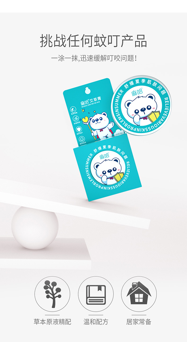麻哈艾草膏產(chǎn)品,主要針對蚊叮后的皮膚外搽使用,可以有效的舒緩蚊蟲叮咬后的皮膚劇癢,滋潤舒緩,微涼舒適。蚊叮蟲咬不適,早涂抹早輕松草本精配低敏配方,溫潤無刺激。寶寶孕婦敏感嬌嫩肌膚均可安心使用,是居家常備,出游佳選。
