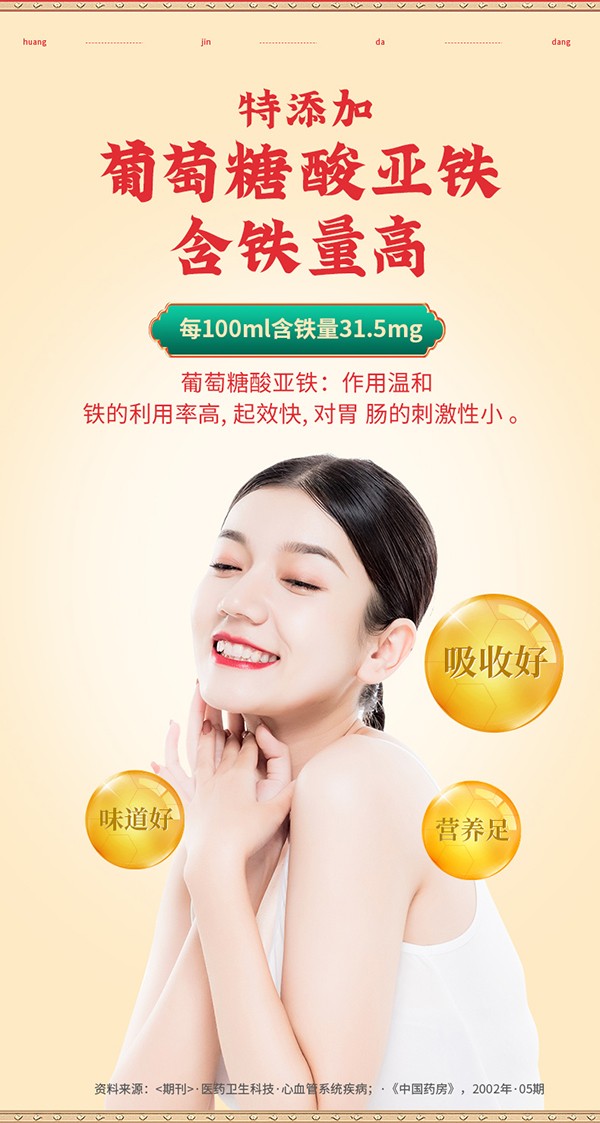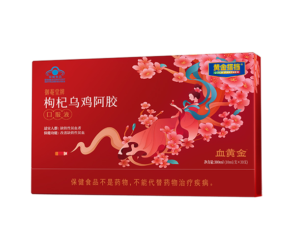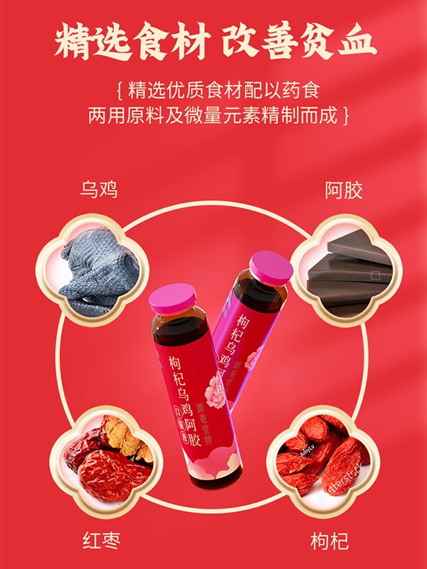 黃金搭檔枸杞烏雞阿膠口服液,藍(lán)帽保健食品,為缺鐵性貧血者精心研制!專注補(bǔ)鐵補(bǔ)血,名副其實(shí)的“血黃金”!精選優(yōu)質(zhì)食材配以藥食兩用原料,如烏雞、枸杞子、大棗、阿膠以及葡萄糖酸亞鐵等等,同時(shí)添加多種微量元素,營(yíng)養(yǎng)成分含量更高,更均衡!每100ml含鐵31.5mg,含粗多糖61mg,上乘滋補(bǔ),溫和好吸收,喚醒好氣色!