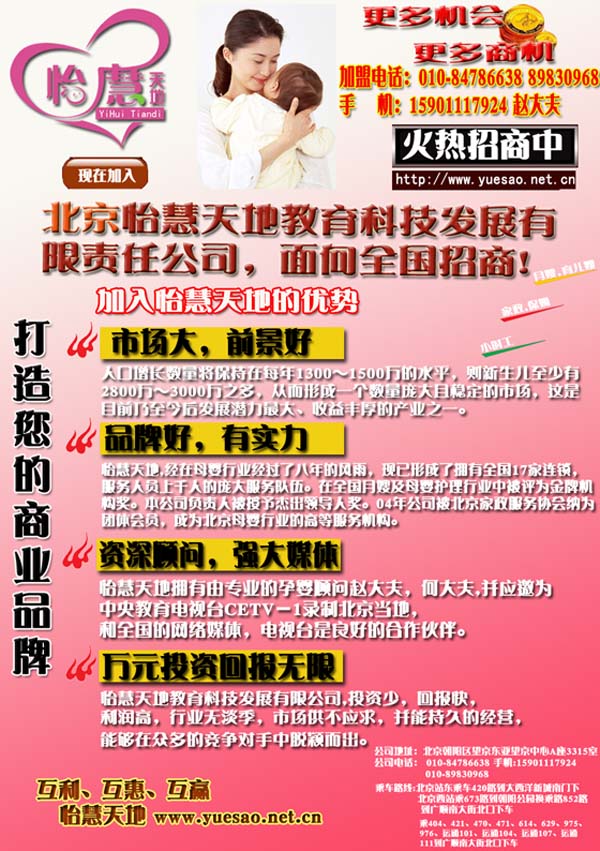 北京怡慧天地教育科技發(fā)展有限責(zé)任公司是一家集婦幼保健咨詢和母嬰服務(wù)為一體的專業(yè)性服務(wù)機(jī)構(gòu)。主要提供孕產(chǎn)期保健咨詢和母嬰護(hù)理服務(wù),并致力于嬰幼兒科學(xué)養(yǎng)育和早期教育的研究。公司聘請了多年從事婦幼保健工作和教育工作的資深人士擔(dān)當(dāng)顧問,由畢業(yè)于著名醫(yī)科大學(xué)的婦幼專家主持,擁有一支經(jīng)驗(yàn)豐富的高素質(zhì)管理人員和母嬰護(hù)理服務(wù)人員的隊(duì)伍。