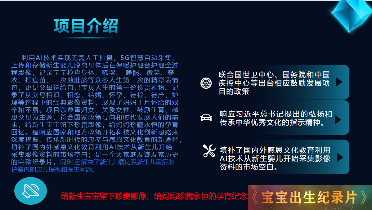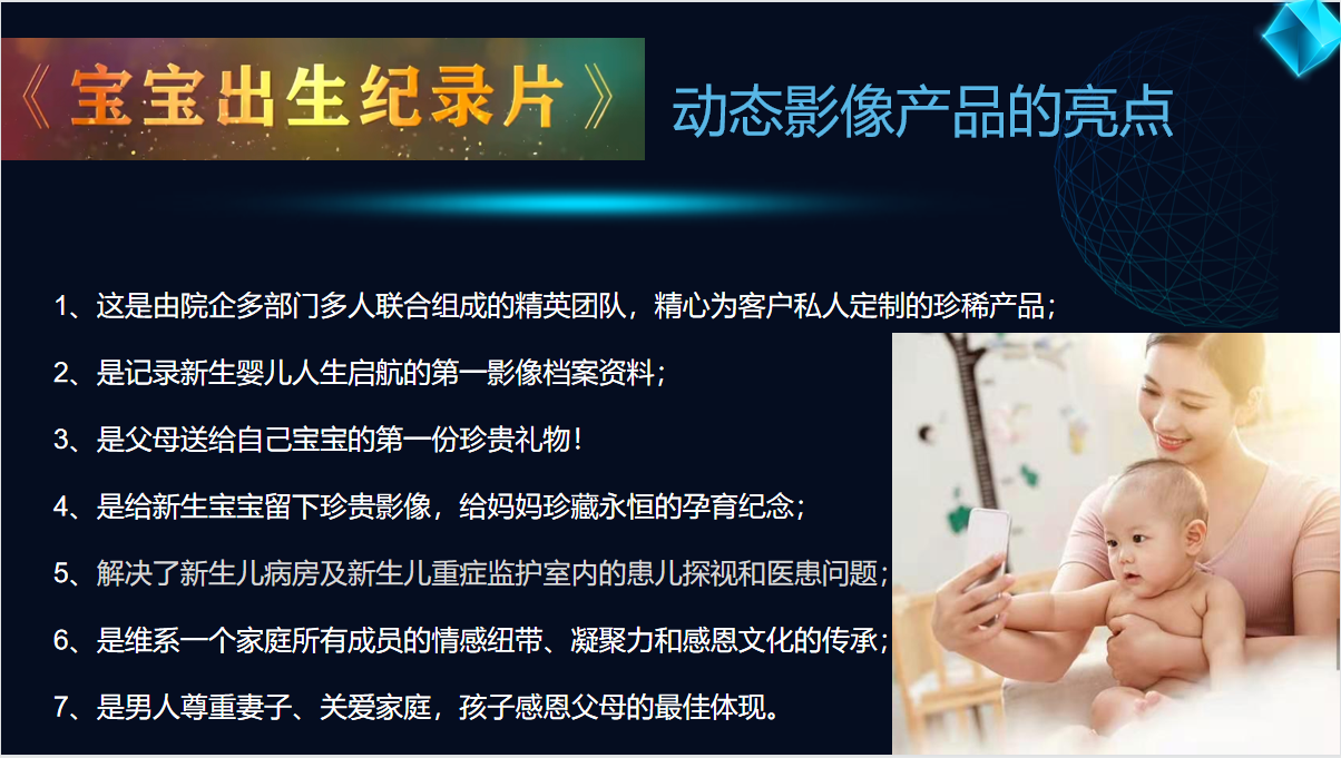 利用國家相關政策的支持,與婦幼婦產醫(yī)院合作,以AI技術自主研發(fā)的專利產品實現5G智慧采集新生兒影像資料,制作一部具有珍藏無價、永恒留戀、尊重婦女、關愛女性、鼓勵生育、感恩父母的動態(tài)影像——《寶寶出生紀錄片》。