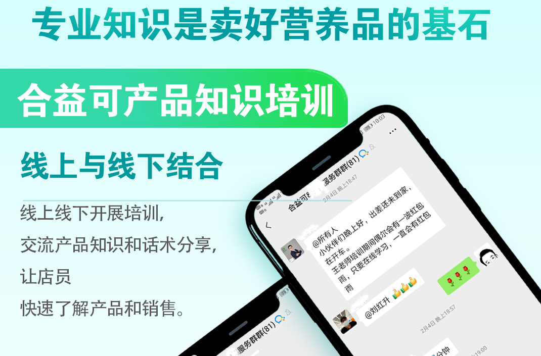 作為一個(gè)專業(yè)營(yíng)養(yǎng)品品牌,深知專業(yè)性對(duì)家庭健康的重要性,更是門店?duì)I養(yǎng)品銷售的核心,門店與客戶信任與忠誠(chéng)的紐帶,再好的營(yíng)養(yǎng)品,離不開專業(yè)的服務(wù),合益可商學(xué)院應(yīng)運(yùn)而生——提升合作門店專業(yè)度。通過(guò)線上線下知識(shí)培訓(xùn)的開展,讓合作門店從最初的產(chǎn)品認(rèn)知到相關(guān)營(yíng)養(yǎng)品知識(shí)學(xué)習(xí),從單一產(chǎn)品的專業(yè)知識(shí)到母嬰護(hù)理全面營(yíng)養(yǎng)知識(shí)學(xué)習(xí)。