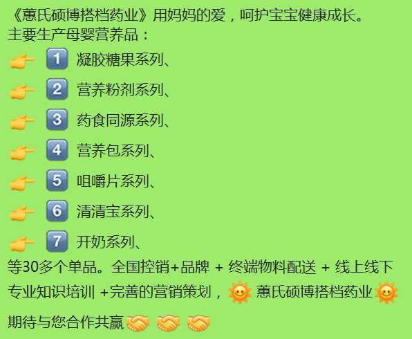主要生產母嬰營養(yǎng)品∶凝膠糖果系列、營養(yǎng)粉劑系列、藥食同源系列、營養(yǎng)包系列、咀嚼片系列、清清寶系列、開奶系列、等30多個單品。全國控銷+品牌+終端物料配送+線上線下專業(yè)知識培訓+完善的營銷策劃,焱蕙氏碩博搭檔藥業(yè)燃期待與您合作共贏