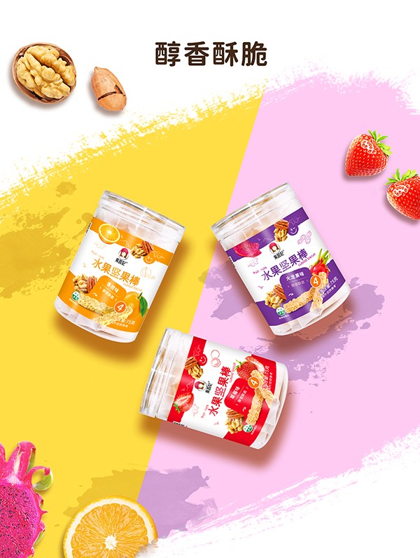 果蔬妃【水果堅(jiān)果棒】充分結(jié)合水果與堅(jiān)果的營(yíng)養(yǎng)成分,融入花生、碧根果、芝麻、核桃的豐富口味,醇香酥脆,適合孕媽寶媽和3歲以上寶寶食用,有火龍果、草莓和香橙3種口味。