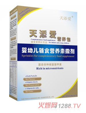 天添愛(ài)輔食營(yíng)養(yǎng)素是根據(jù)嬰幼兒的身體特征而研發(fā)的保健產(chǎn)品,產(chǎn)品中含有很豐富的維生素,能改善嬰幼兒身體素質(zhì),給寶寶有一雙明亮的眼睛,讓您的寶寶更加可愛(ài)。