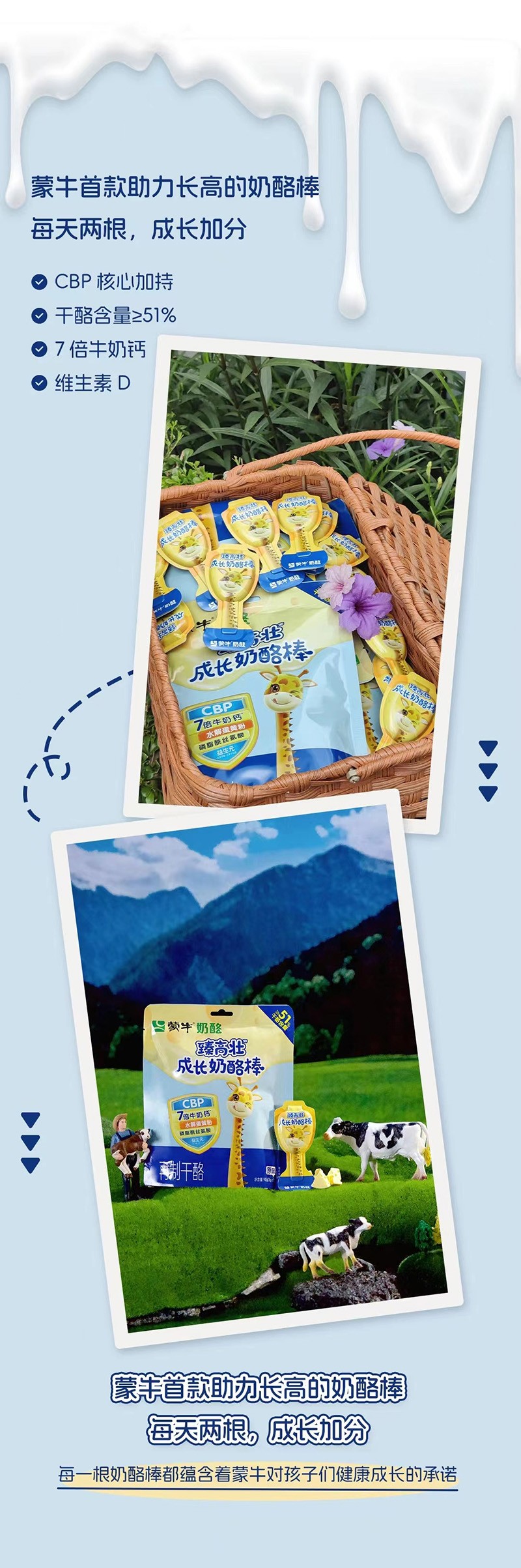 蒙牛臻高壯成長奶酪棒,是蒙牛專為中國3-15歲青少年研發(fā),立志提高青少年平均身高的再制干酪。無論是作為早餐搭配、課間享受都是優(yōu)質的選擇。蒙牛選擇的牛奶原料都來自于控制優(yōu)良的飼養(yǎng)環(huán)境,加之它的獨特制作工藝,使得奶酪棒既保留了原有的滋味,又增添了濃厚的奶香,口感豐富多變。