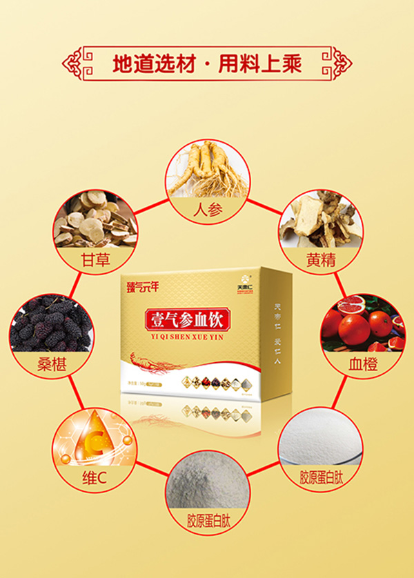 生命益元素臻氣元年,地道選材,用料上乘,以人參、黃精、血橙、甘草、桑椹等為主要原料,藥食同源配方,添加膠原蛋白肽、維生素C,科學(xué)配比,營(yíng)養(yǎng)均衡。