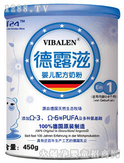 德露滋為德國(guó)制造的奶粉,在德國(guó)同步銷售的商標(biāo)為VIBALEN,盒裝。在亞洲華語(yǔ)地區(qū)為VIBALEN德露滋,聽(tīng)裝。