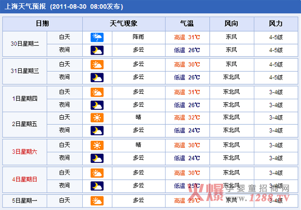 為期四天的2011中國(上海)國際孕嬰童用品展覽會展出時間,除了關(guān)注展會上的情況之外,還要注意一下上海這幾天的天氣變化情況,以下是上海未來一周的天氣情況: